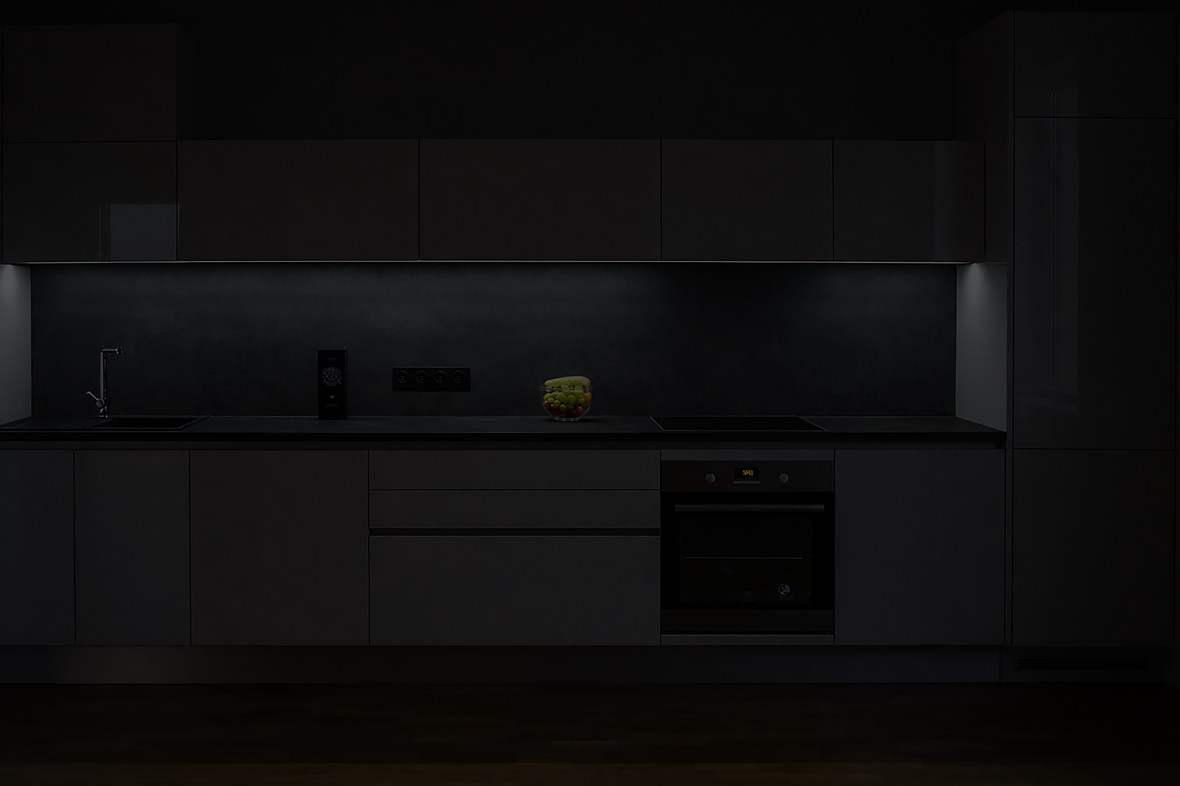 Virtuves kompozīcija veidota lineārā izkārtojumā, kas organiski iekļaujas dzīvojamās zonas telpā. Tumšā darba virsma un stikla sienas panelis rada vizuālu kontrastu, savukārt dabīgā koka faktūra piešķir interjeram siltumu un līdzsvaru.