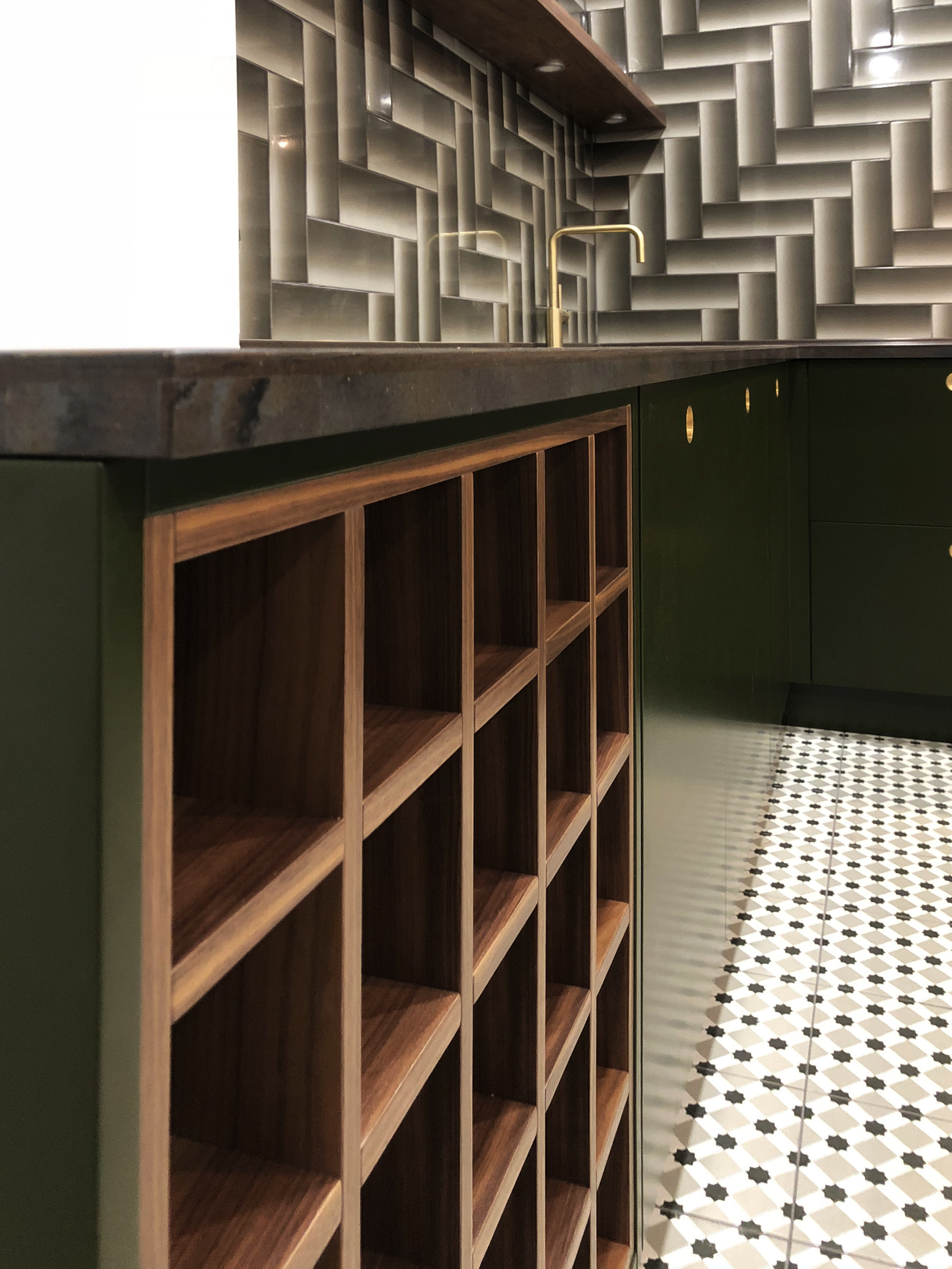 Atklāts vīna plaukts no dabīgā koka ir integrēts virtuves apakšējā stāvā. Plaukti ir paredzēti vairāk nekā 30 pudelēm un kalpo kā dekoratīvs interjera elements.