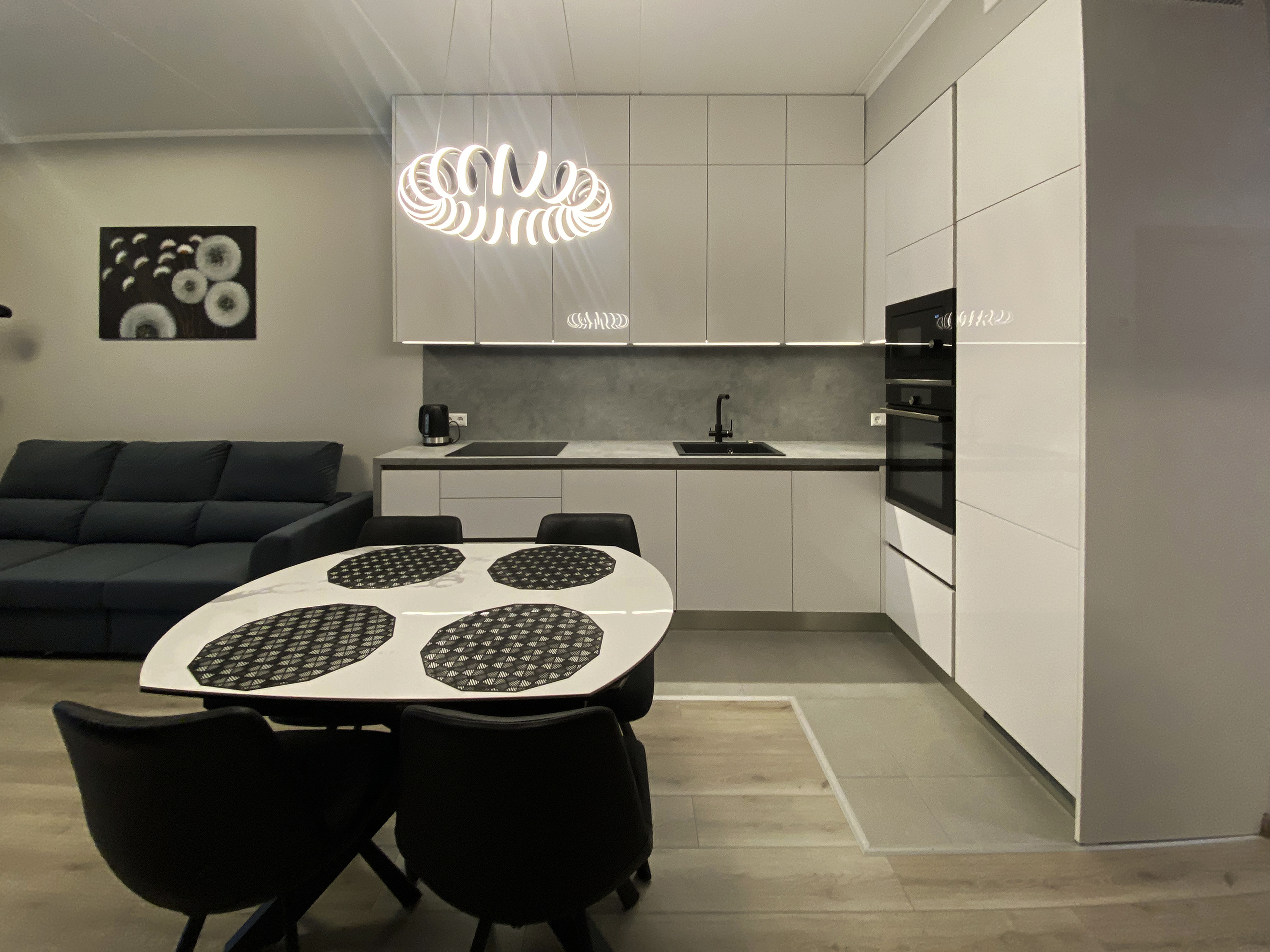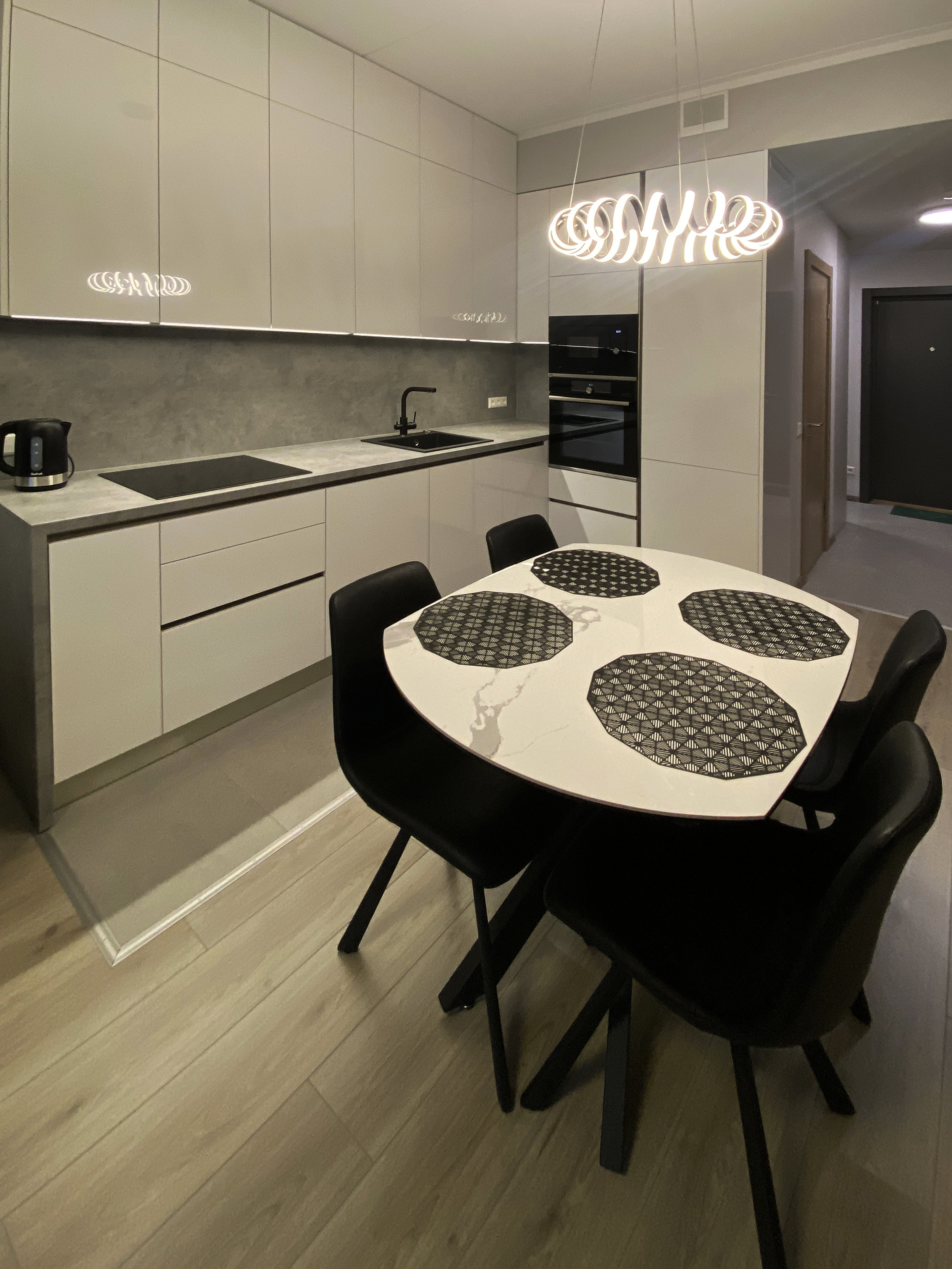 Cepeškrāsns, mikroviļņu krāsns un plīts ir iebūvētas vienā ansamblī. Slēpta tvaika nosūcēja un integrēta LED apgaismojuma pabeidz virtuves tehnoloģisko izskatu.